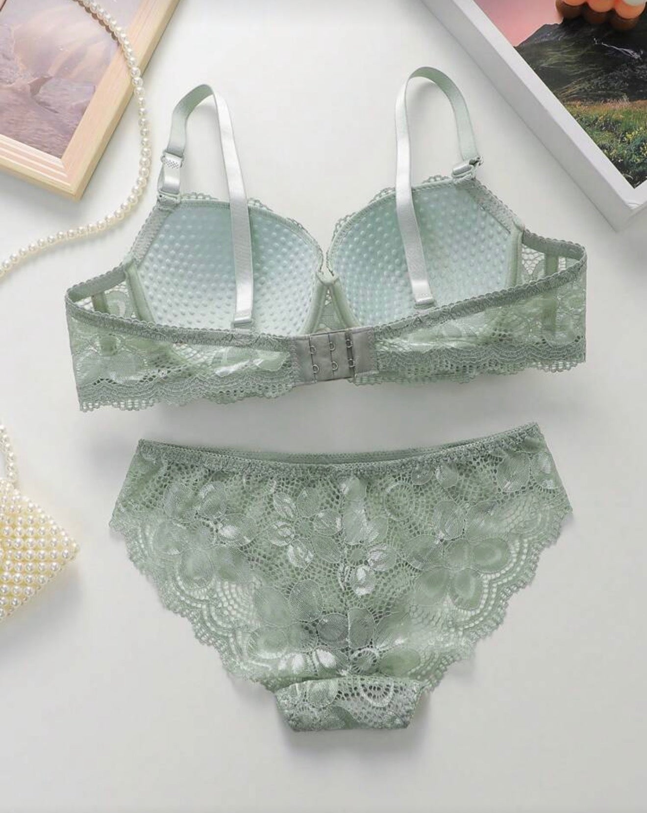Този нежен и стилен комплект дамско бельо е създаден, за да съчетае комфорт, елегантност и женственост. Фината флорална дантела в мек зелен нюанс придава свежо и изискано излъчване, подходящо както за ежедневието, така и за специални моменти.