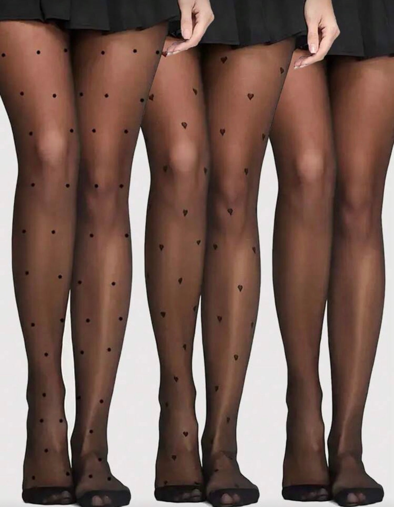 Добавете стилен и закачлив акцент към визията си с този елегантен дамски чорапогащник с фигурален дизайн. Фината прозрачна материя е декорирана с нежни точки и сърца, които придават женствено и модерно излъчване.