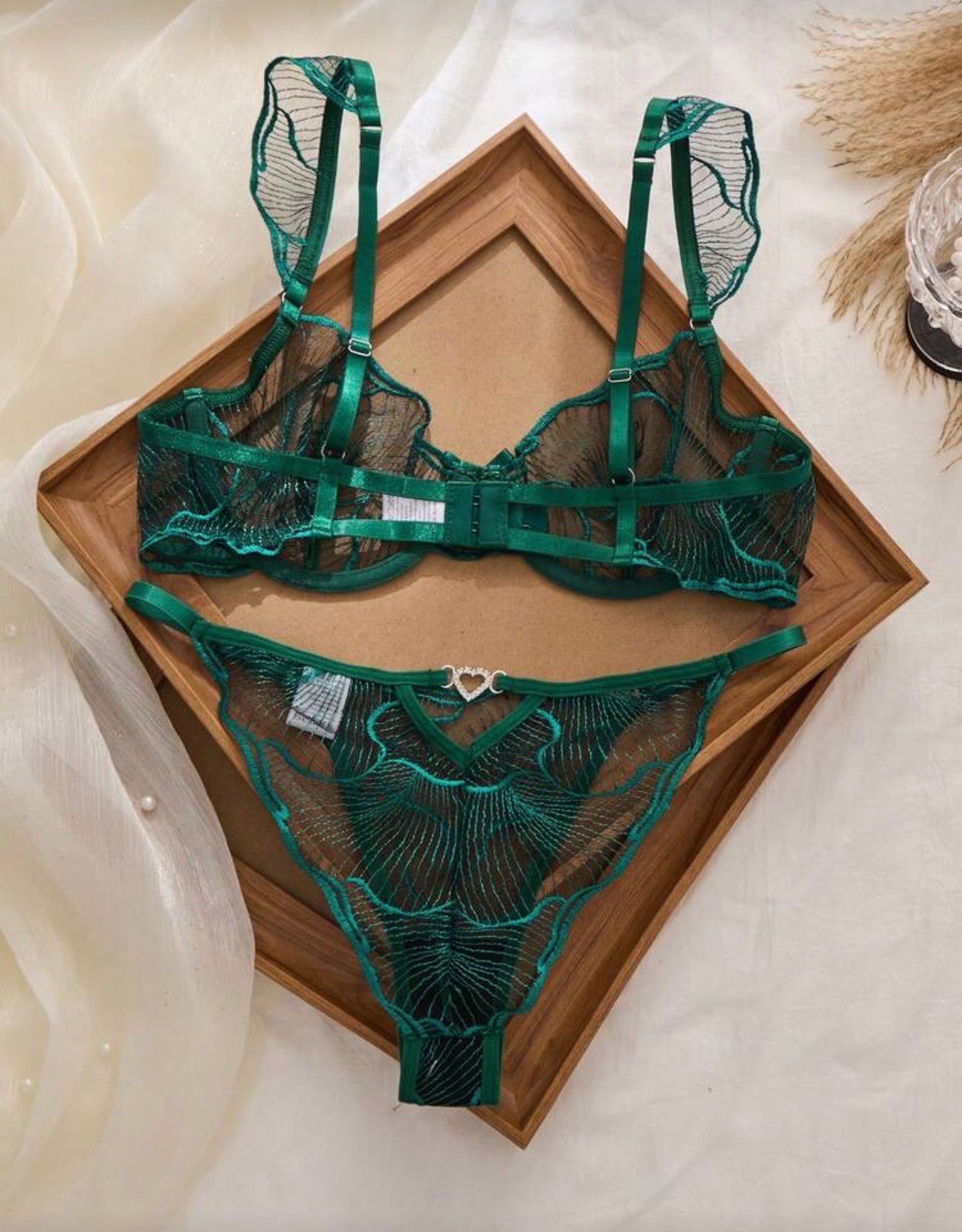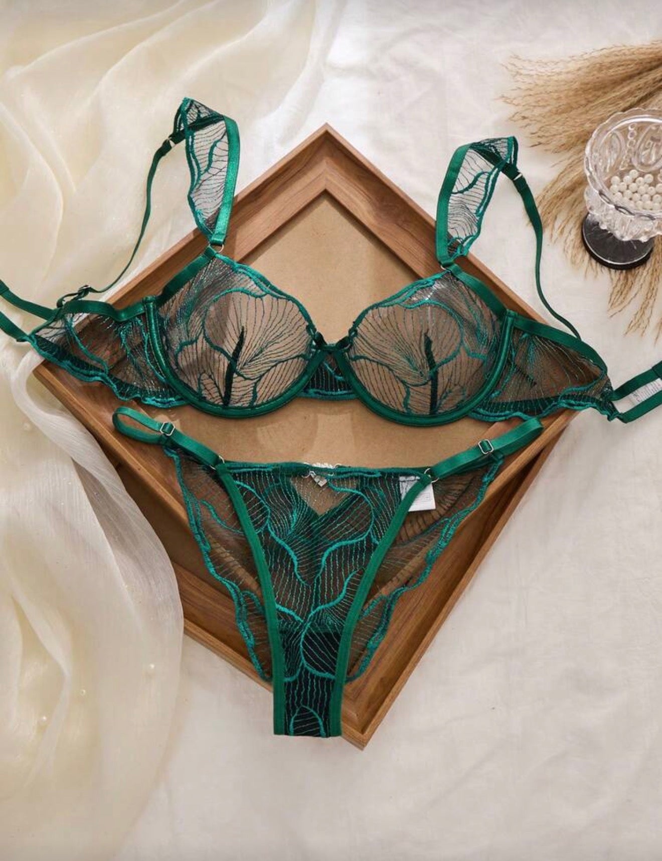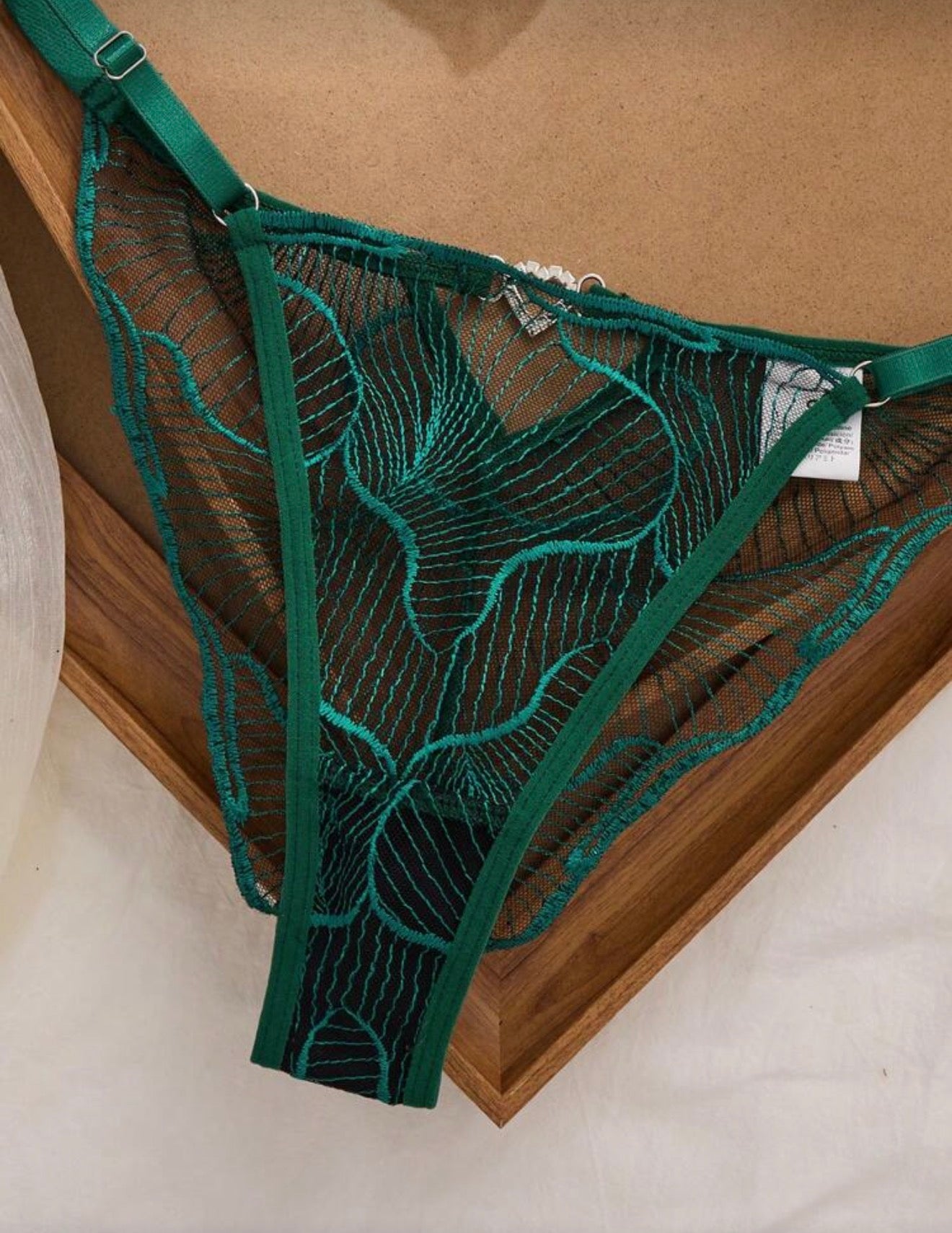 Елегантен дамски комплект сутиен и бикини от дантела – зелено